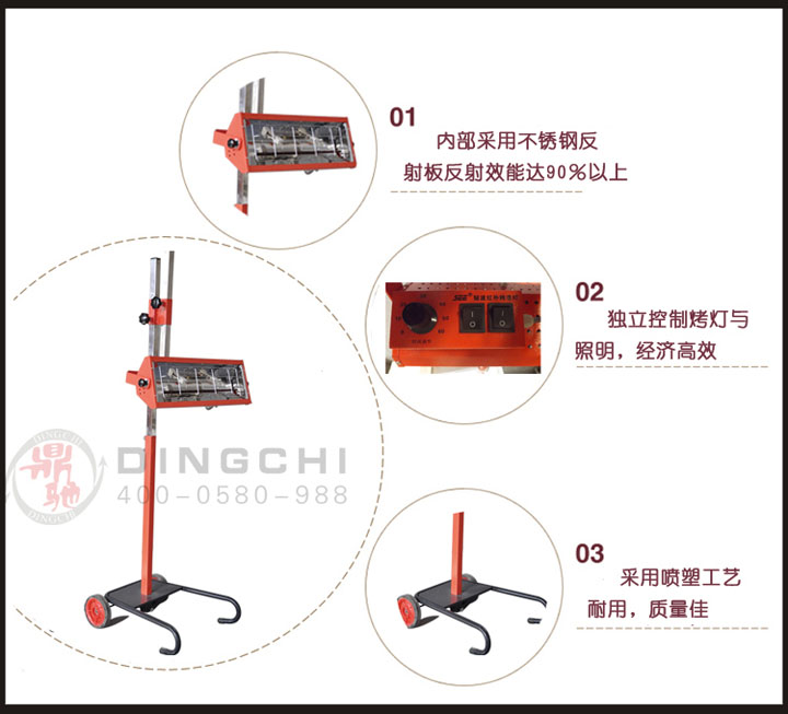 四、设计灵活,结构轻巧,经济高效。烤灯可以根据需要调整高度和角度,可对汽车的各个部位
