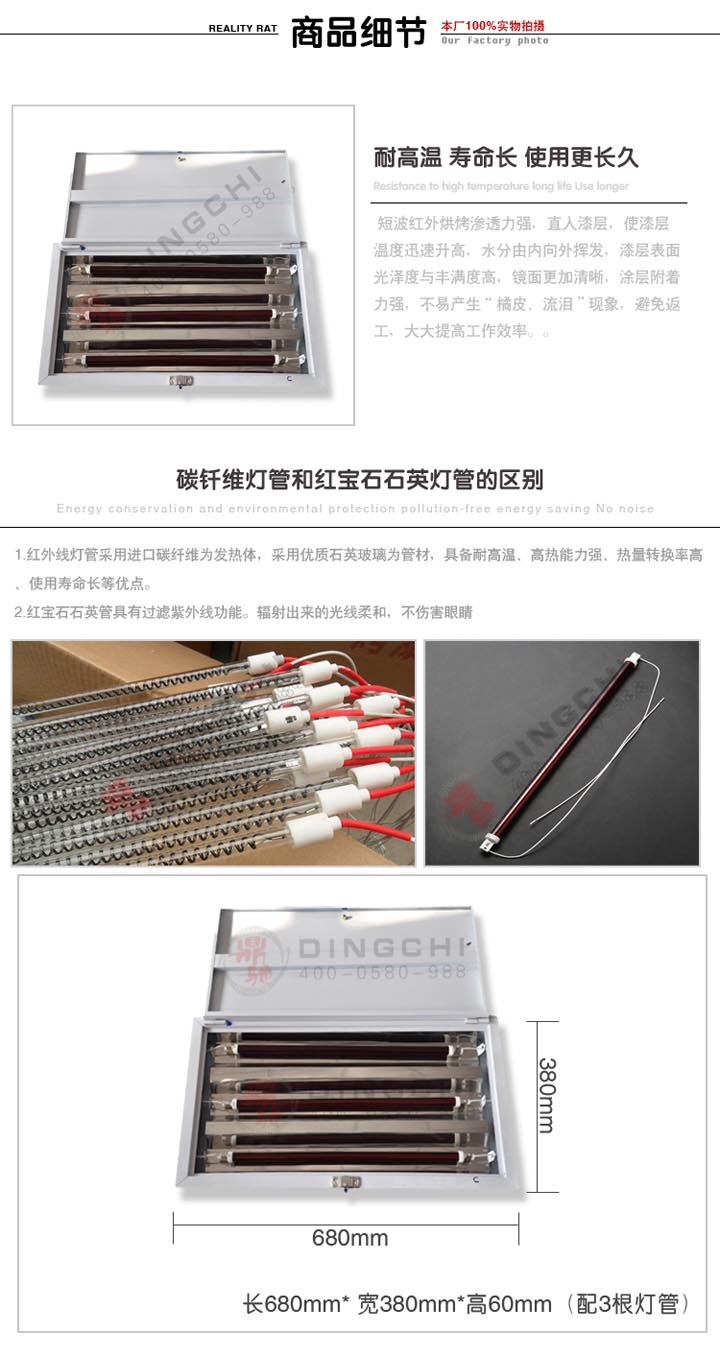 特性: 短波红外线灯管选用高透过率、高纯、脱羟、防爆石英玻管和进口钨加热丝制作,保证短波红外线灯管良好的波长性能和超长的使用寿命,并能胜任骤冷骤热的频繁起动。 ) 1、. 短波红外烘烤渗透力强,直入漆层,使漆层温度迅速升高,水分由内向外挥发,漆层表面光泽度与丰满度高,镜面更加清晰,涂层附着力强,不易产生“橘皮、流泪”现象,避免返工,大大提高工作效率。 2、红宝石石英管具有过滤紫外线功能。辐射出来的光线柔和,不伤害眼睛 6、使用.寿命长达6000小时以上 7、.安装方便,维护和使用成本更低 技术参数: 灯管功率:1kw/支 灯管长度:530mm 灯管直径:10mm 灯箱: 长680mm* 宽380mm*高60mm(配3根灯管) 应用范围: 汽车烤漆、家电、医疗、印刷、食品、塑料、陶瓷、纺织、造纸、玻璃、光波炉、金属加工等需要加热、干燥、固化、表面处理的行业。涵盖从民用到工业的各个角落。
